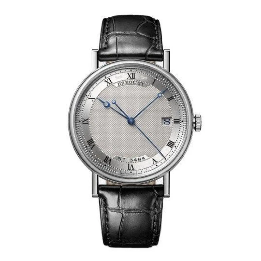 Посеребрённый, гильошированный, эмаль. Римские часовые индексы по радиусу циферблата и классические вороненные стрелки. Окно даты, в отметке на 15.00 часов.