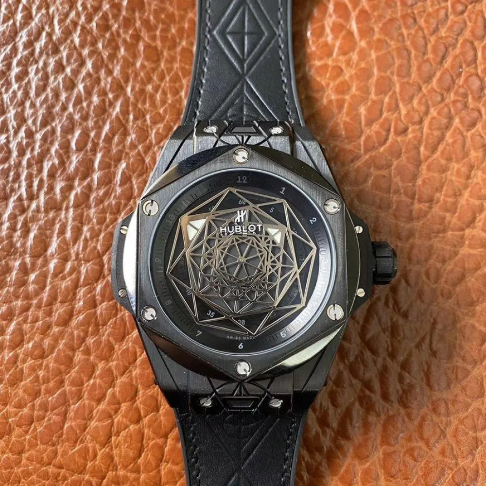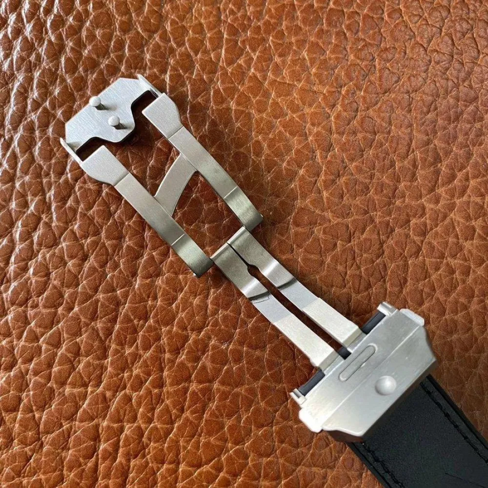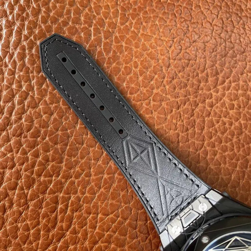 Черный кожаный ремешок, с двойной раскладывающейся стальной застежкой Hublot. Система быстрой смены ремешка при помощи пушеров на корпусе часов.
