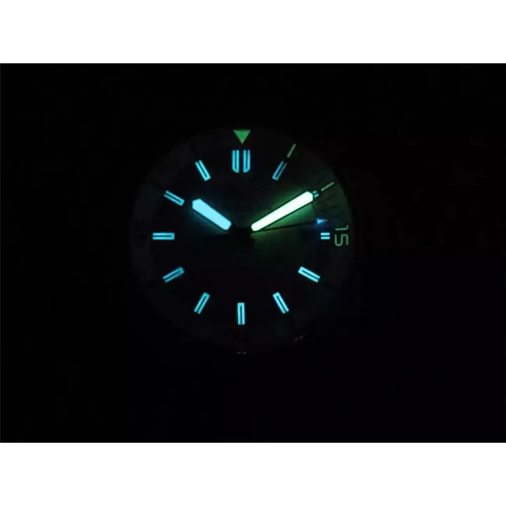 Белый. Часовые риски и мечевидные стрелки, покрытые люминесцентным составом Super LumiNova С1. Окно даты в отметке на 15.00 часов.