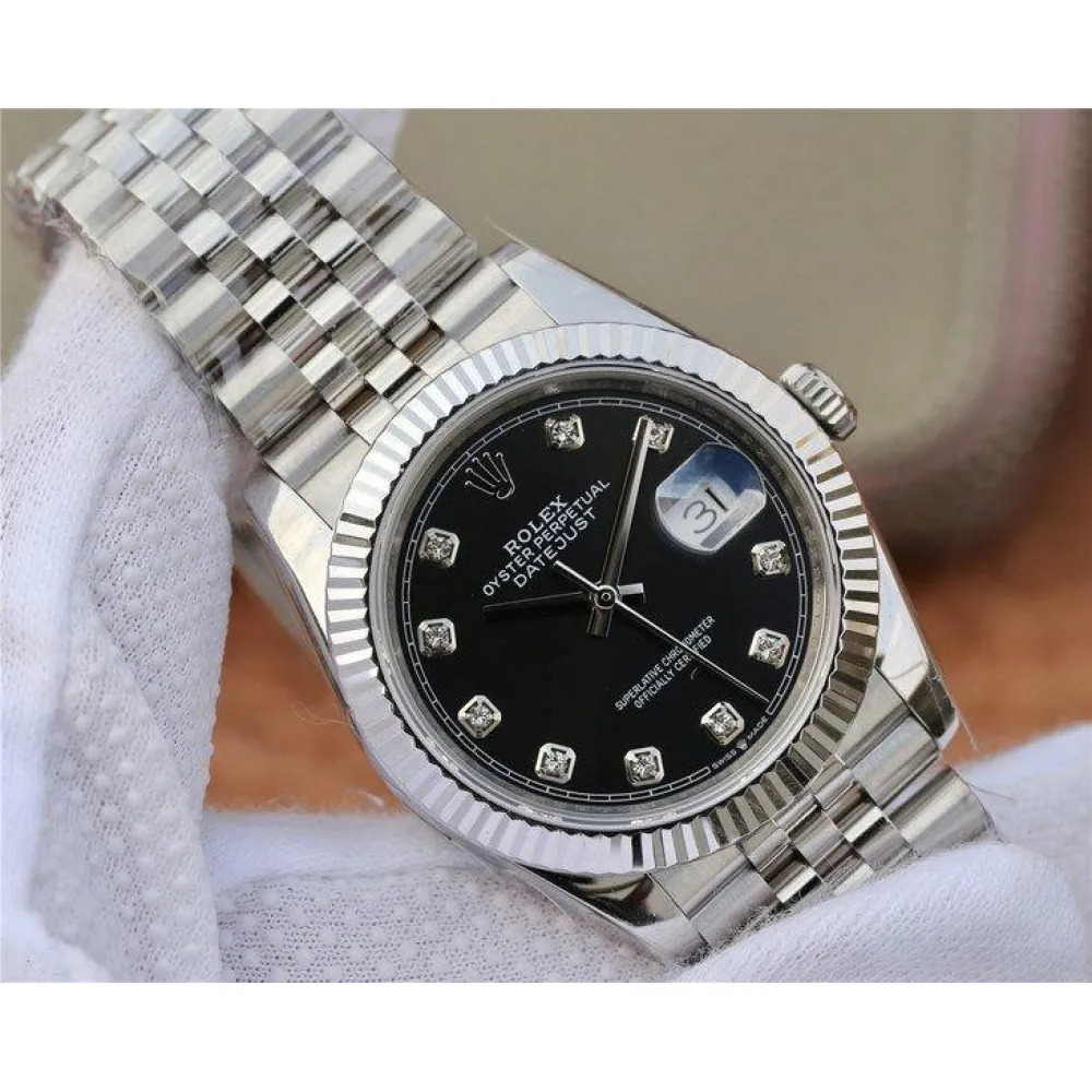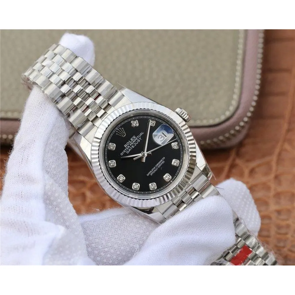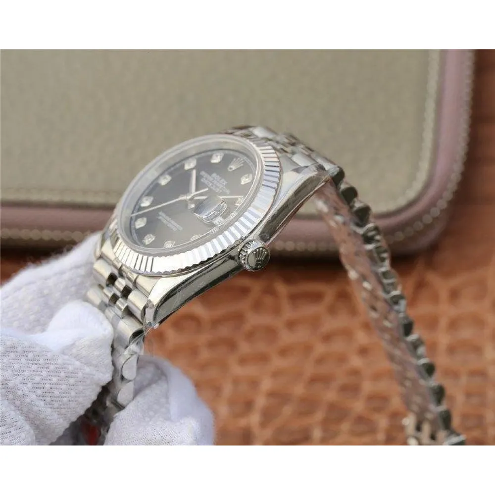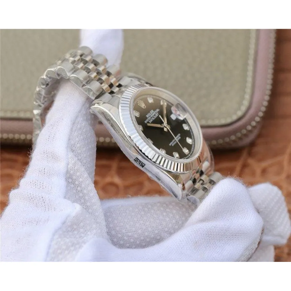Черный. Часовые риски, инкрустированные белыми сапфирами (МОР). Окно даты в отметке на 15.00 часов под увеличительным окном 2,5. Гравировка маркировки Rolex и серийного номера Rolex на внутреннем ранте.