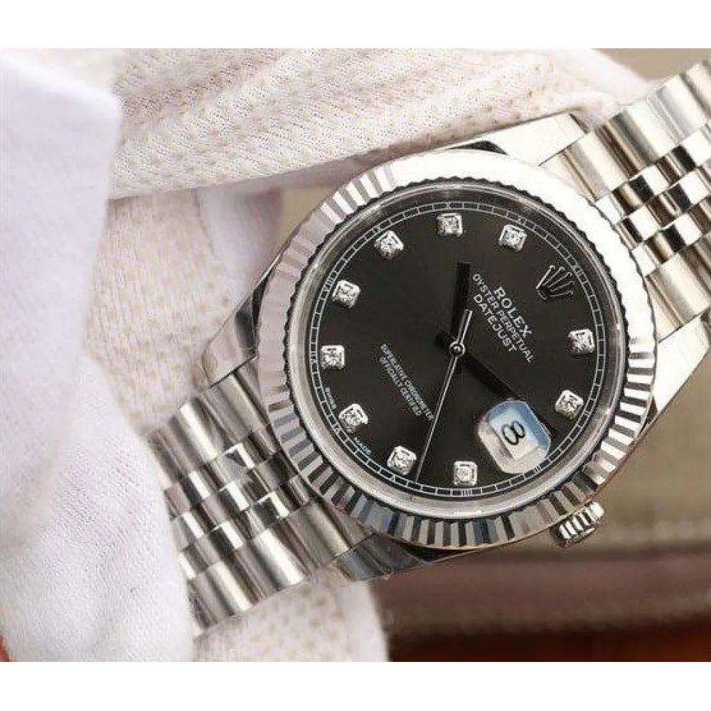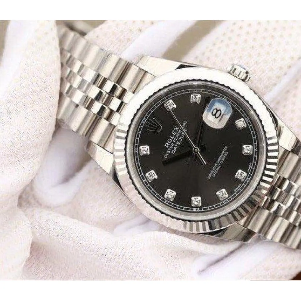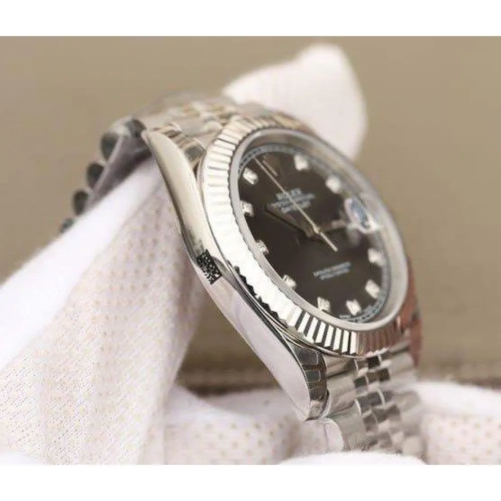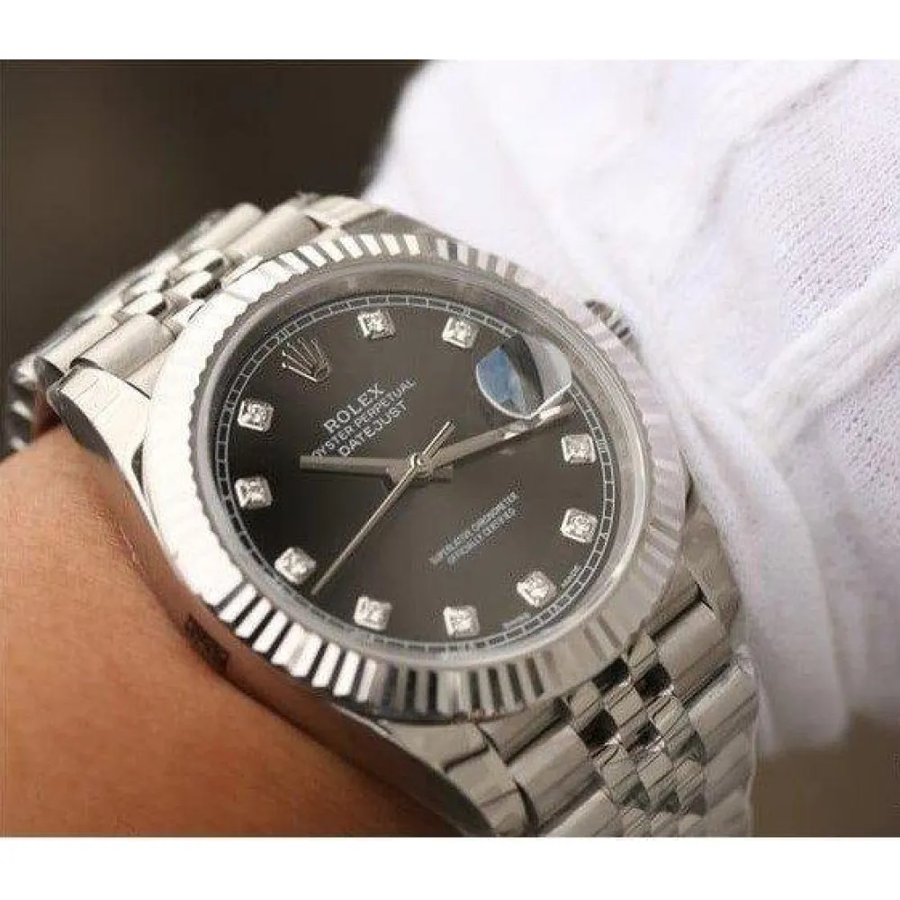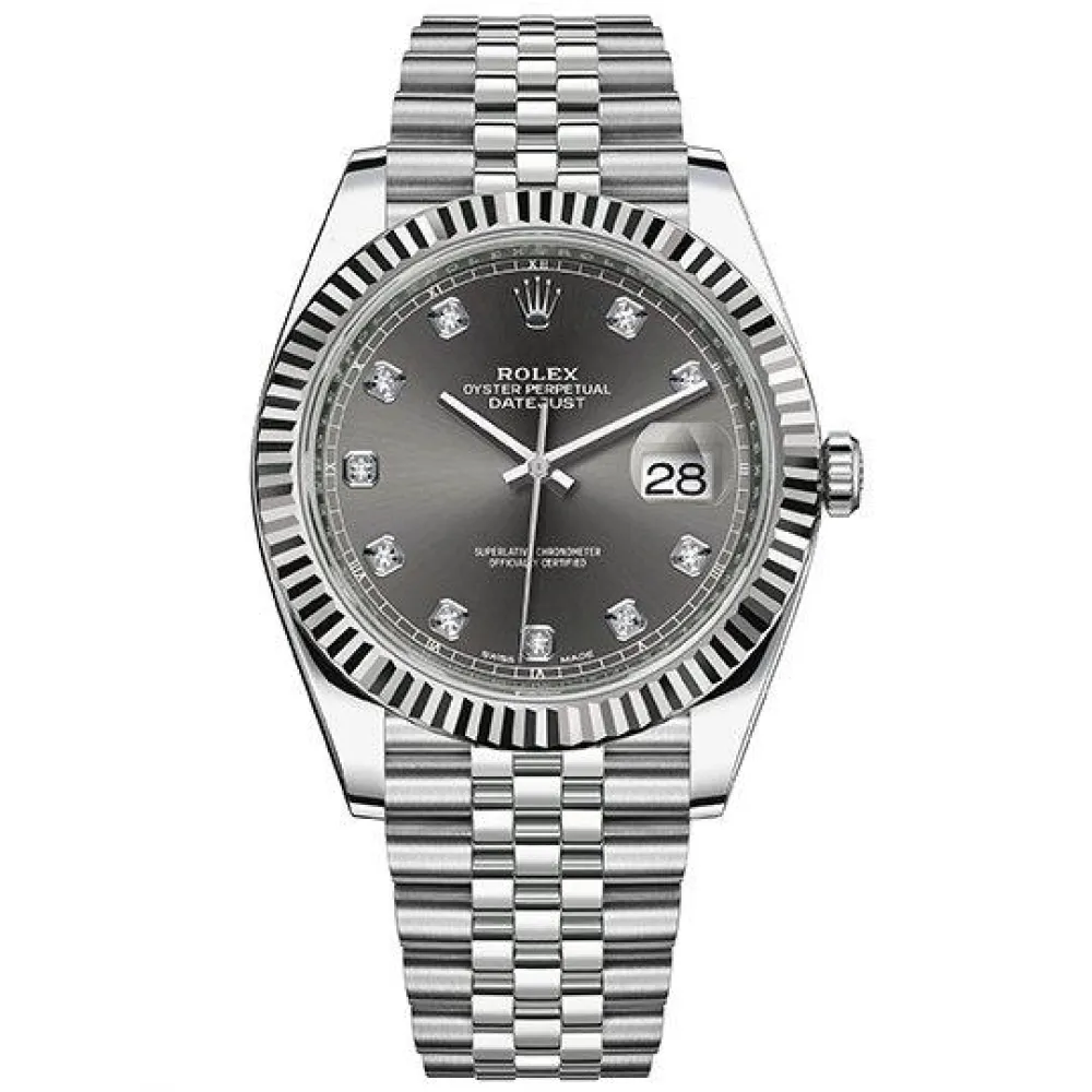 Графитовый (Rhodium), переливающийся. Часовые риски, инкрустированные белыми сапфирами (МОР). Окно даты в отметке на 15.00 часов под увеличительным окном 2,5. Гравировка маркировки Rolex и серийного номера Rolex на внутреннем ранте.