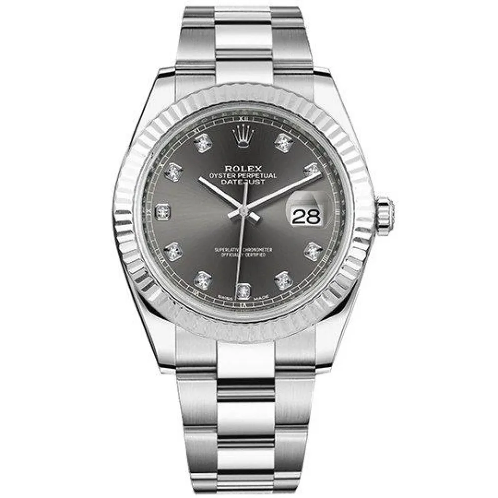 Серый, переливающийся. Часовые риски, инкрустированные белыми сапфирами. Окно даты в отметке на 15.00 часов под увеличительным окном 2,5. Гравировка маркировки Rolex и серийного номера Rolex на внутреннем ранте.