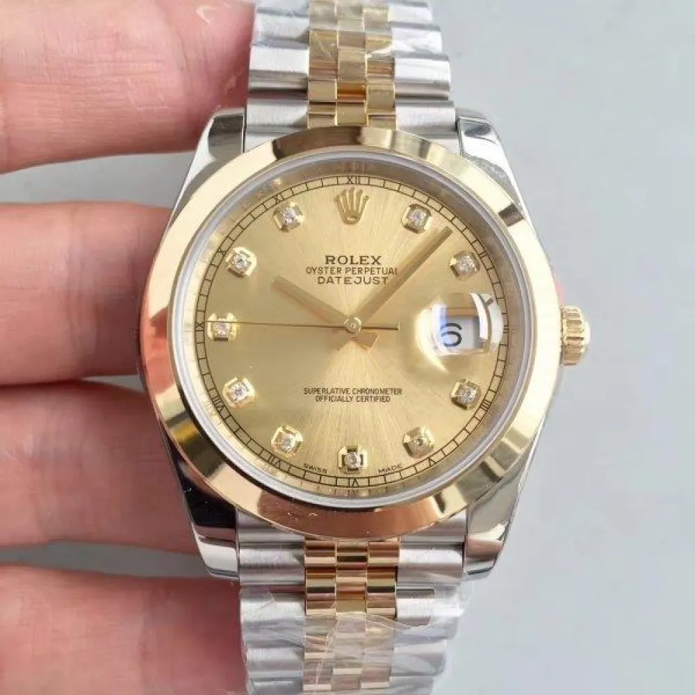Позолоченный, переливающийся. Позолоченные часовые риски, инкрустированные белыми сапфирами. Окно даты в отметке на 15.00 часов под увеличительным окном 2,5. Гравировка маркировки Rolex и серийного номера Rolex на внутреннем ранте