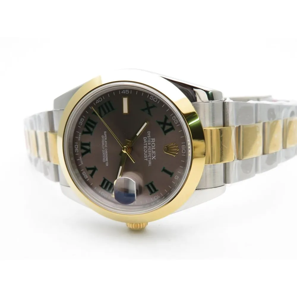 Серый, переливающийся. Зеленые римские часовые индексы. Позолоченные часовые риски и стрелки, покрытые люминесцентным составом Super LumiNova С1 + С3. Окно даты, расположенное в отметке на 15.00 часов, под увеличительным окном 2.5