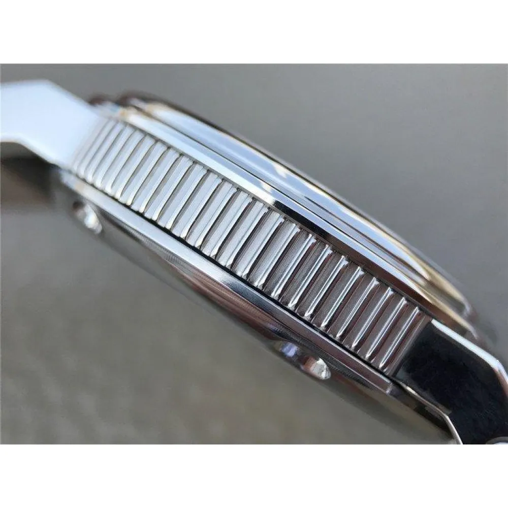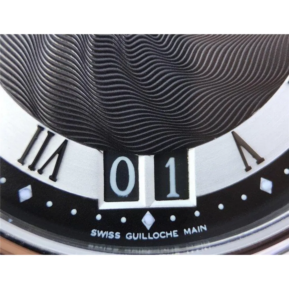 Чёрный, гильошированный. Вороненные римские часовые индексы и полированные стрелки. Панорамное окно даты, расположенное в отметке на 18:00 часов