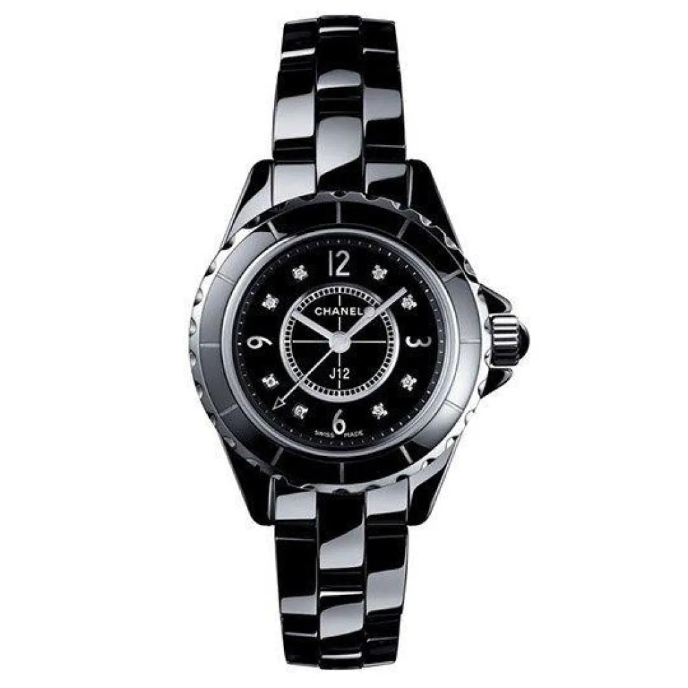 Чёрный (эмаль). Часовые риски, инкрустированные белыми сапфирами и белые стрелки. Окно даты, расположенное в отметке на 16:30 часов.