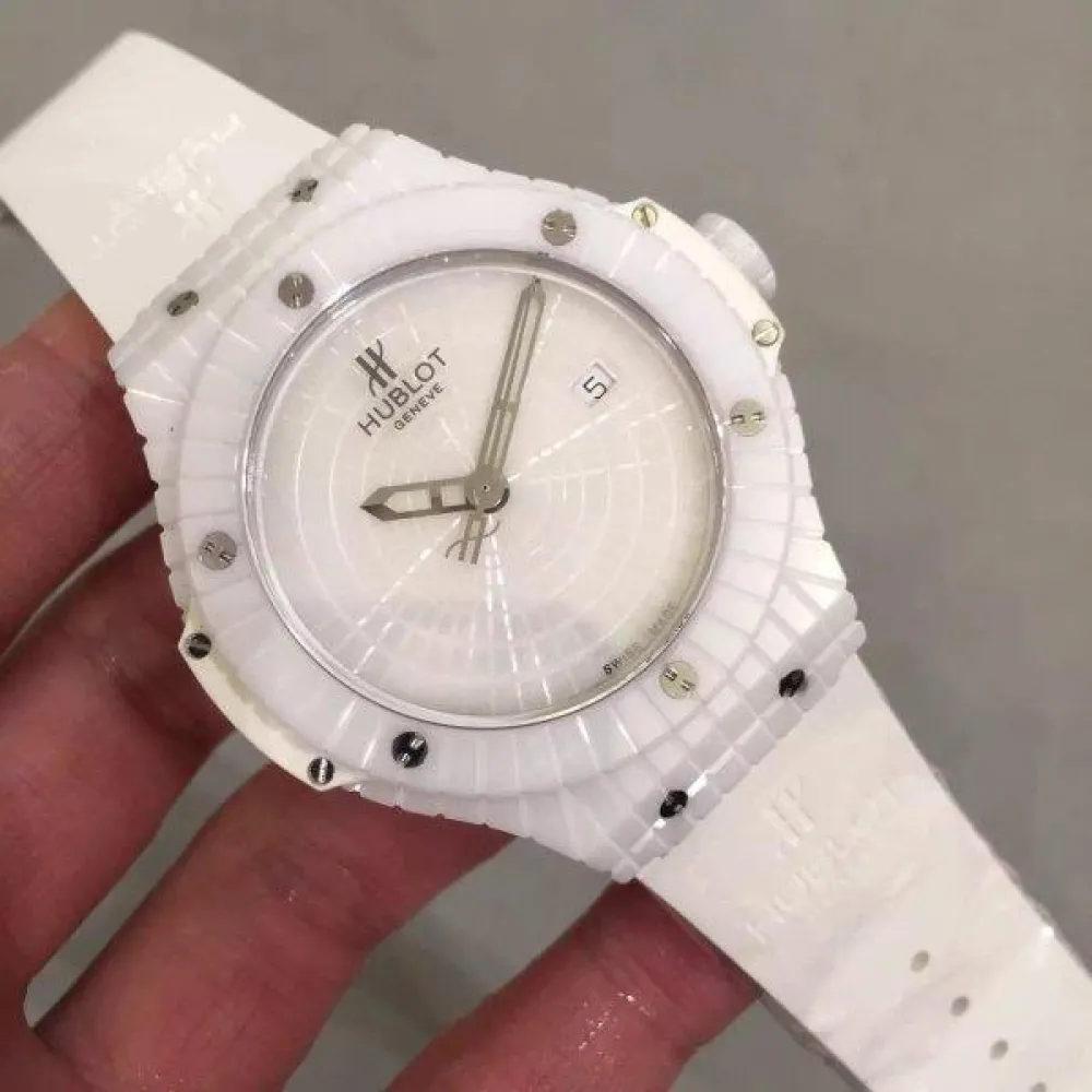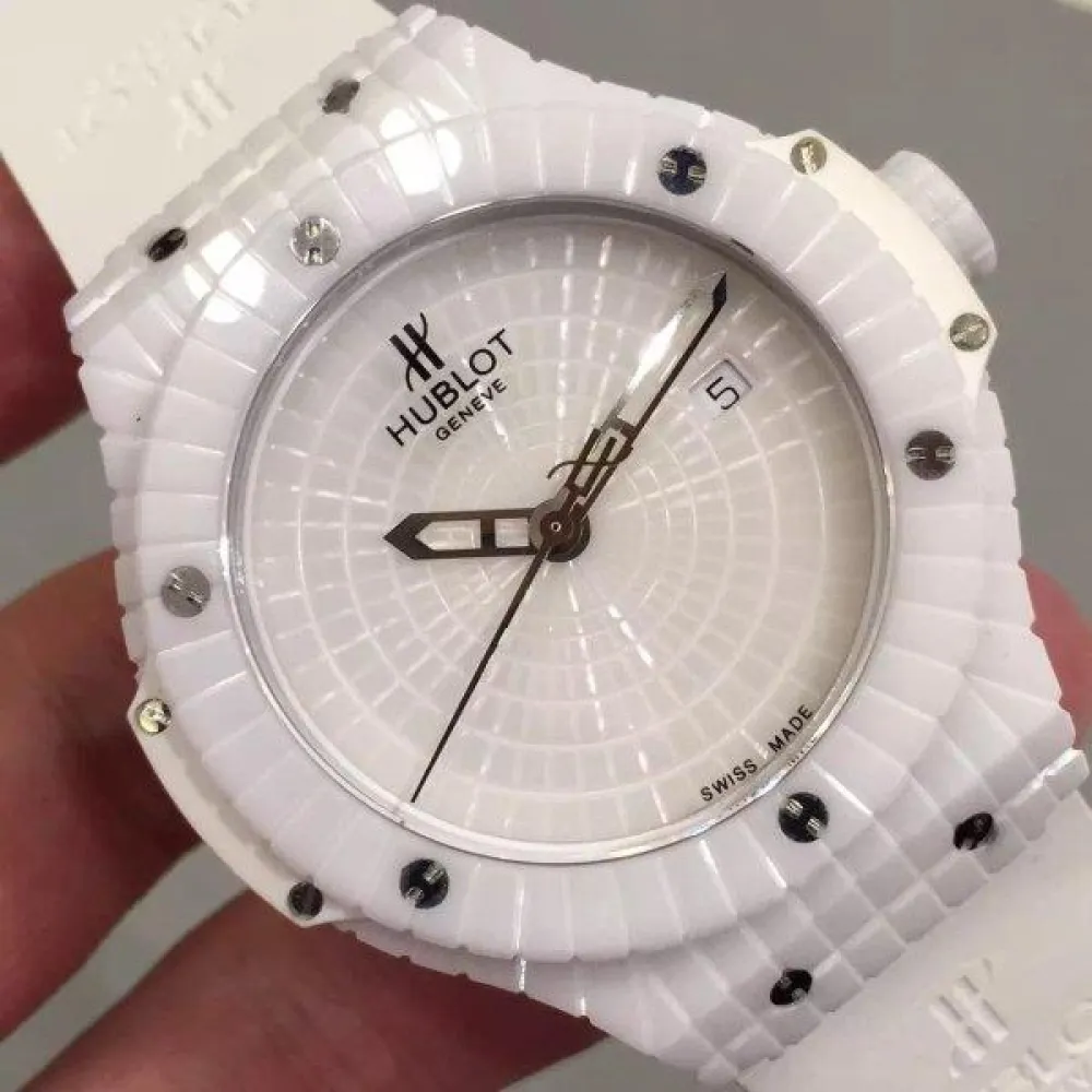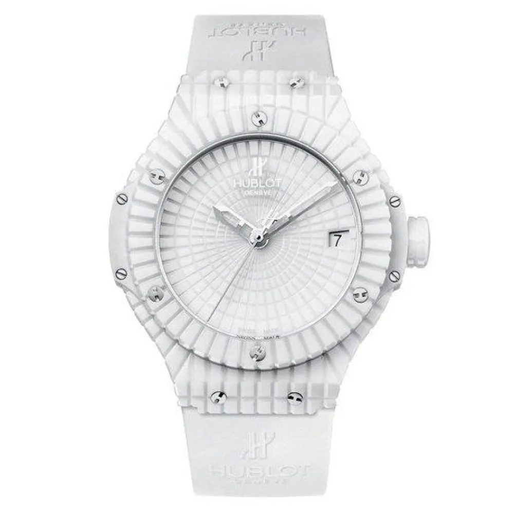 Белый, керамический. Стальные сатинированные стрелки. Окно даты, расположенное в отметке на 15.00 часов