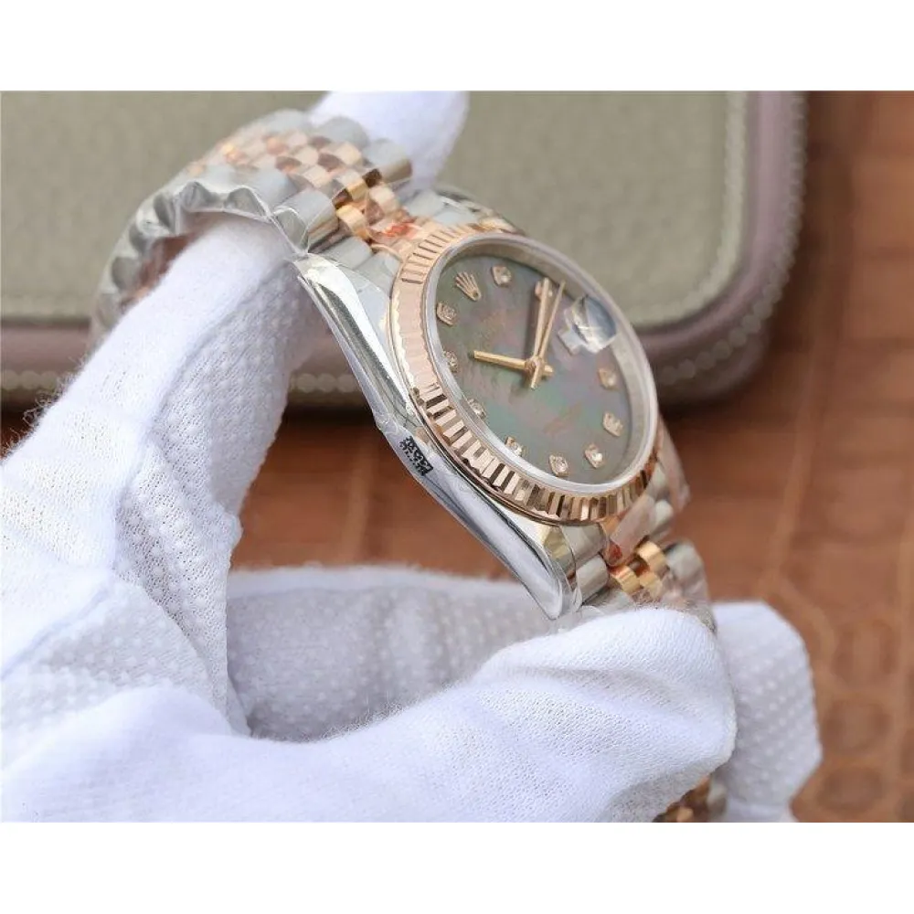 Фиксированный в одном положении, позолоченный полированный рифленный безель; Гравировка маркировки Rolex (3 короны Rolex) с внутренней стороны безеля.