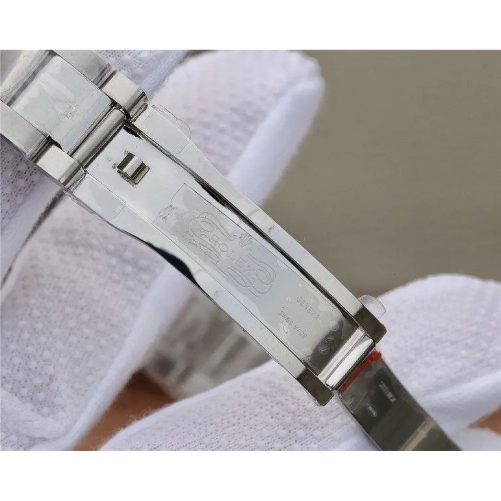 Фиксированный в одном положении, стальной полированный выпуклый безель; Гравировка маркировки Rolex (3 короны Rolex) с внутренней стороны безеля.