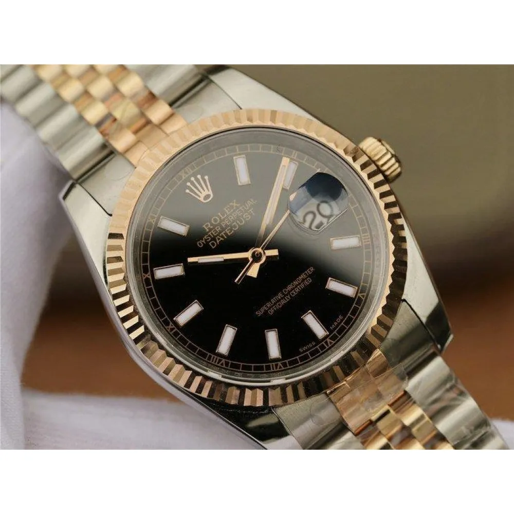Чёрный (эмаль). Позолоченные часовые риски и стрелки, покрытые люминесцентным составом Super LumiNova С3. Окно даты в отметке на 15.00 часов под увеличительным окном 2,5. Гравировка маркировки Rolex и серийного номера на внутреннем ранте.
