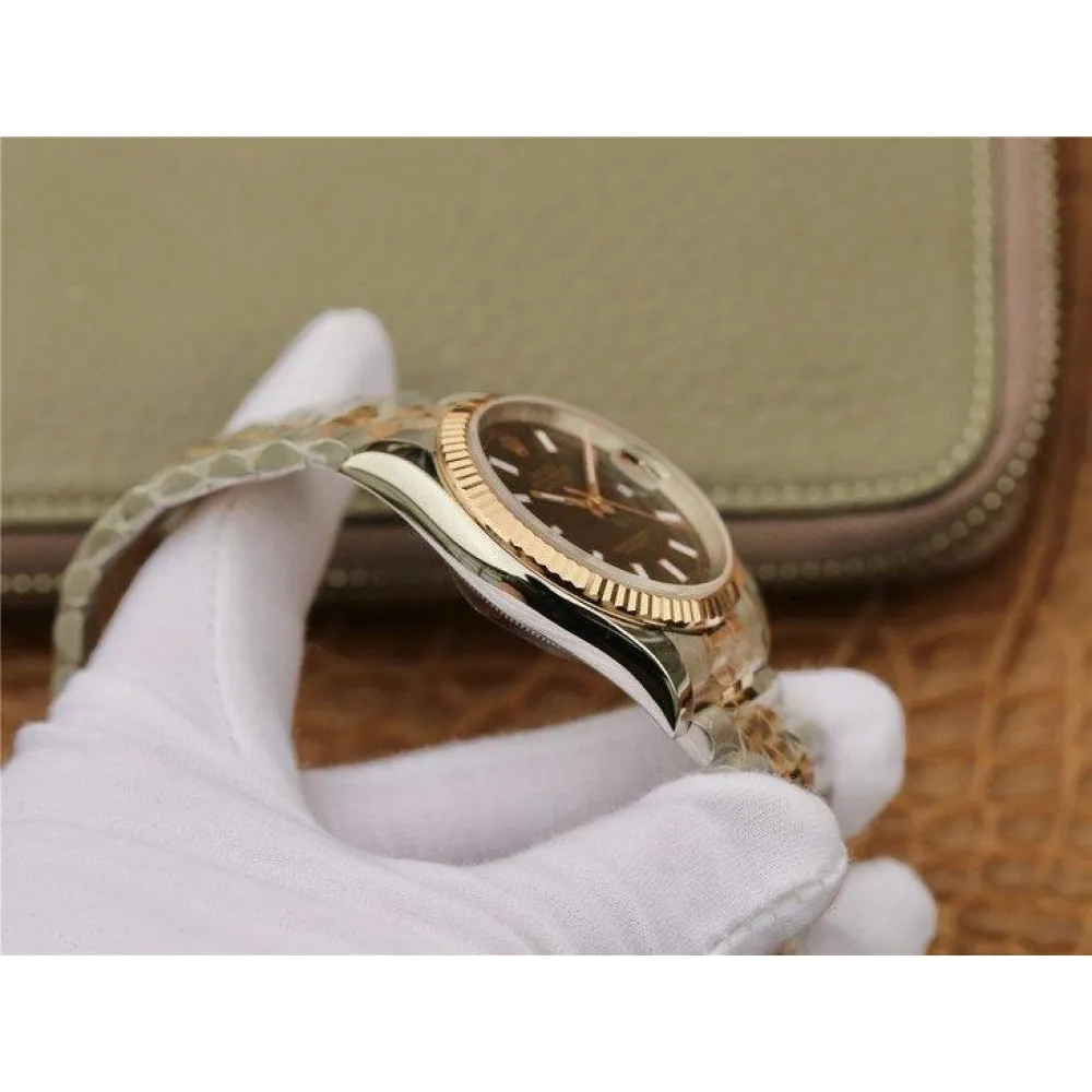 Фиксированный в одном положении, позолоченный полированный рифленный безель; Гравировка маркировки Rolex (3 короны Rolex) с внутренней стороны безеля.