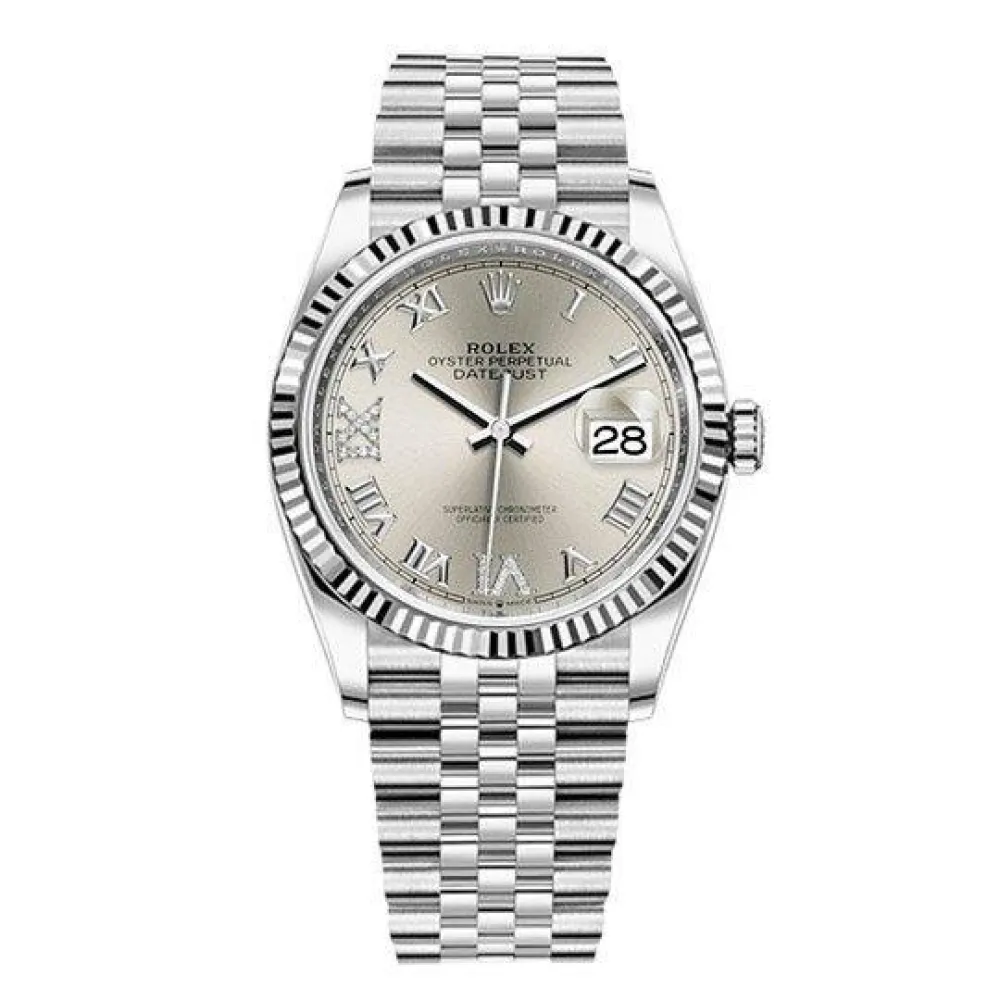 Зелёный, переливающийся. Полированные римские часовые индексы, инкрустированные сапфирами и полированные стрелки. Окно даты в отметке на 15.00 часов под увеличительным окном 2,5. Гравировка маркировки Rolex и серийного номера на внутреннем ранте.