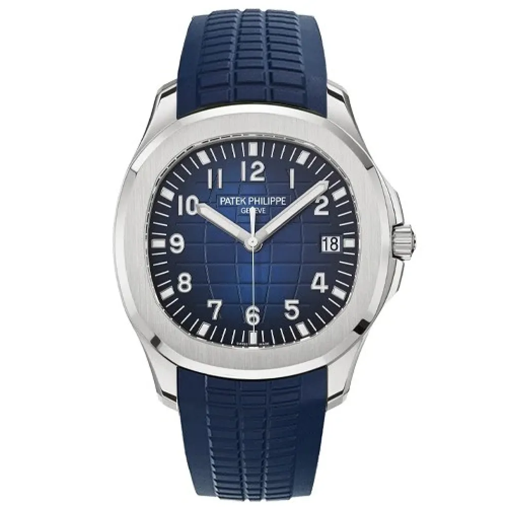 Дизайн Patek Philippe Aquanaut 5168G-001 отличается современным и динамичным стилем, который идеально подходит для активных и уверенных в себе людей. Синий циферблат с рельефным узором создает эффект глубины и привлекает внимание, а белое золото корпуса подчеркивает статус владельца.